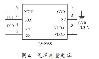 氣壓模塊選用BOSCH公司生產(chǎn)的具有溫度補償能力的集成數(shù)字氣壓傳感器BMP085[6],它包含電阻式壓力傳感器、AD轉(zhuǎn)換器和控制單元,其中控制單元包括E2PROM和I2C接口。這種數(shù)字壓力傳感芯片的供電電壓為1.8~3.6 V,它具有超低功耗(標(biāo)準(zhǔn)工作模式下5 mA;待機電流0.1 mA)、高精度(低功耗模式下分辨率為0.06 hPa)和高可靠性,已廣泛應(yīng)用于天氣預(yù)報、GPS精準(zhǔn)導(dǎo)航、垂直速度指示和風(fēng)扇功率控制等領(lǐng)域,其經(jīng)濟性和適用性均符合本設(shè)計的要求,BMP085的輸出與外加壓強成正比,測量范圍是300~1 100 hPa,完全校準(zhǔn)數(shù)字輸出,在完成采樣后,通過I2C 總線直接將數(shù)據(jù)傳送給微處理器。氣壓測量電路如圖4 所示。值得注意的是,BMP085數(shù)字壓力傳感器對氣壓?海拔高度提供了參考公式,利用該公式配合傳感器測量的氣壓值能夠較好地得到海拔高度[6?7].