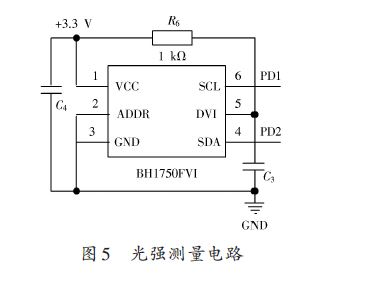 光強模塊的主要部件是BH1750FVI[8?9],這是一種16 位數(shù)字輸出型環(huán)境光強度傳感器集成芯片,其具有兩線式串行總線接口,內(nèi)置了16位AD轉(zhuǎn)換器,功耗低,集成度高,不需任何輔助器件就能夠完成光照度測量,設(shè)計人員無需考慮傳感器標(biāo)定、信號放大、模/數(shù)轉(zhuǎn)換等過程,只需通過I2C BUS接口完成傳感器設(shè)置與照度讀取等操作。BH1750FVI光源依賴性弱,受紅外線影響很小,能夠測量范圍廣泛的輸入光(相當(dāng)于1~65 536 lx),可對廣泛的亮度進行1 lx的高精度測定。利用它的高分辨率可以探測較大范圍的光強度變化,能夠根據(jù)收集的光線強度數(shù)據(jù)來調(diào)整液晶或者鍵盤背景燈的亮度。