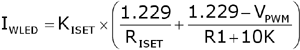 PWM 信號(hào);其中,KISET為有源電流鏡像電路比值,典型值為900;VDC用于模擬調(diào)光的直流電壓;VPWM用于模擬調(diào)光的PWM信號(hào)的峰峰值;RISET、R1為輸出電流設(shè)置電阻,一般在千歐姆級(jí)。