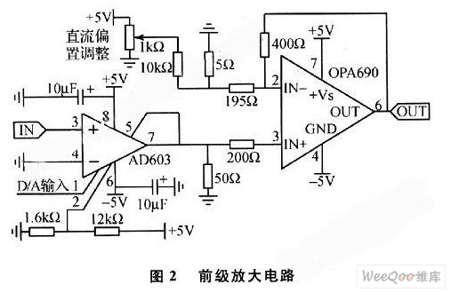 普通的寬帶放大器一般不包括直流成分,級與級之間通過電容耦合,這樣可以有效地避免各級之間靜態(tài)工作點相互影響。本項目要求放大器放大的信號頻率可延伸至直流,由于實際測試發(fā)現(xiàn)AD603輸出含有與增益無關的直流電壓,因此需要在AD603之后設置直流偏置調(diào)整電路。實際電路如圖2所示。電路采用精密運放OPA690構成同相比例放大器,因前級電路的零點漂移電壓為正值,需在放大器的反相輸入端加一可調(diào)直流偏壓。