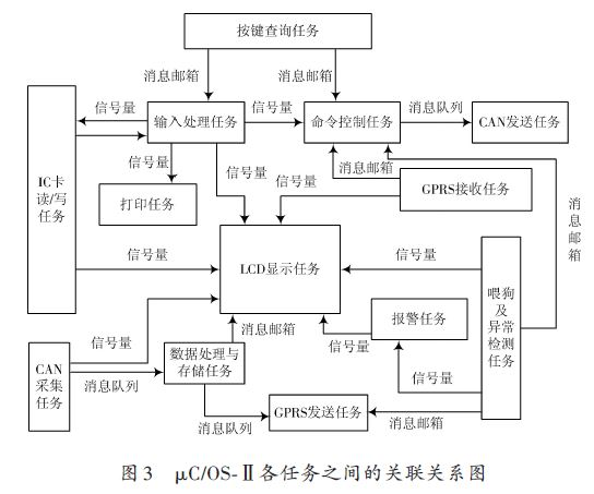 為實現(xiàn)監(jiān)控終端的功能要求,在μC/OS-Ⅱ中設(shè)計了以下13個任務(wù):顯示任務(wù)、鍵盤查詢?nèi)蝿?wù)、輸入處理任務(wù)、打印任務(wù)、數(shù)據(jù)的存儲任務(wù)、IC 卡的讀/寫任務(wù)、GPRS 的發(fā)送任務(wù)、CAN 數(shù)據(jù)的接收任務(wù)、CAN 數(shù)據(jù)的發(fā)送任務(wù)、GPRS的接收任務(wù)、命令控制任務(wù)、報警任務(wù)及看門狗的喂狗和異常檢測任務(wù)。