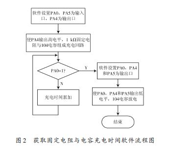 根據(jù)測溫原理,溫度測量的關(guān)鍵是獲取固定電阻與104電容組成充電回路的充電時(shí)間Tf 、獲取熱敏電阻與104電容組成充電回路的充電時(shí)間TX .獲取1 kΩ固定電阻與104電容組成充電回路的充電時(shí)間Tf 的軟件流程圖如圖2所示。