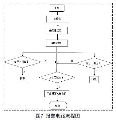 如果當(dāng)注塑機(jī)料管所檢測位置的溫度超過我們設(shè)定的上限溫度或者下限溫度時(shí),后續(xù)操作將直接影響產(chǎn)品的質(zhì)量。所以需要在溫度傳感器檢測到溫度達(dá)到上限或者下限溫度是要用蜂鳴器進(jìn)行報(bào)警從而提醒操作人員進(jìn)行糾正操作,從而解除警報(bào),保證產(chǎn)品的正常生產(chǎn)。報(bào)警電路流程圖如圖7所示。