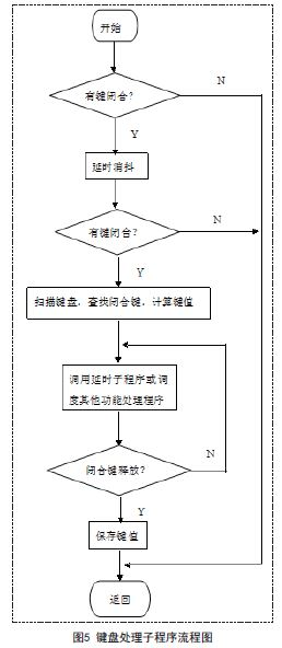 鍵盤是本系統(tǒng)主要的信息輸入方式,是實(shí)現(xiàn)人機(jī)對話的主要途徑。本系統(tǒng)采用4*4行列矩陣式鍵盤。在實(shí)時(shí)控制時(shí),首先調(diào)用鍵盤掃描子程序,判斷系統(tǒng)是否有按鍵按下,若沒有,則返回。若有鍵按下,則進(jìn)行相應(yīng)的處理。按功能把16按鍵分為兩種,一種是0-9是個(gè)數(shù)字鍵,另一種是6個(gè)功能鍵,分別為上限、下線、設(shè)溫、確定、測溫、復(fù)位。鍵盤處理子程序流程圖如圖5所示。