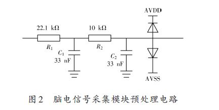 因此,將腦電信號不經(jīng)過放大和調(diào)理直接經(jīng)過簡單的低通濾波后進(jìn)行模數(shù)轉(zhuǎn)換仍可以滿足需要,故預(yù)處理電路設(shè)計(jì)如圖2所示,其頻率響應(yīng)函數(shù)為: