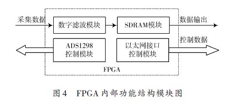 本系統(tǒng)使用Verilog HDL語言單獨(dú)編寫A/D轉(zhuǎn)換器的控制模塊、SDRAM存儲(chǔ)器控制模塊、數(shù)字濾波器模塊以及以太網(wǎng)端口傳輸控制模塊,通過功能仿真和時(shí)序仿真來驗(yàn)證各個(gè)模塊是否能夠獨(dú)立完成相對應(yīng)的控制功能。驗(yàn)證成功后,終通過例化,在FPGA內(nèi)部形成一個(gè)腦電信號采集系統(tǒng)的處理控制模塊,圖4為處理控制模塊的具體功能結(jié)構(gòu)模塊框圖。