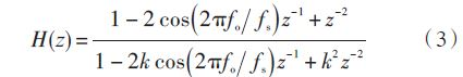 本系統(tǒng)的數(shù)字濾波模塊主要為50 Hz 陷波器和數(shù)字帶通濾波器,兩者的軟件設(shè)計(jì)方法相似,這里重點(diǎn)介紹50 Hz 的陷波器設(shè)計(jì)方法。本系統(tǒng)中設(shè)計(jì)的陷波器技術(shù)指標(biāo)為:抽樣頻率fs 為1 kHz,陷波頻率fo 為50 Hz,3 dB 帶邊頻率為45 Hz和55 Hz,阻帶上下邊頻率為49 Hz和51 Hz,阻帶衰減不小于40 dB.為了便于硬件的實(shí)現(xiàn),本文選用二階的IIR 陷波器,其傳遞函數(shù)如式(3)所示: