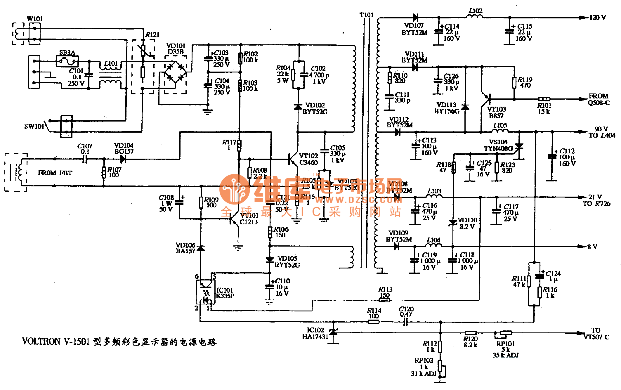 VOLTRON V-1501型多頻彩色顯示器的電源電路圖